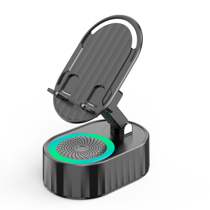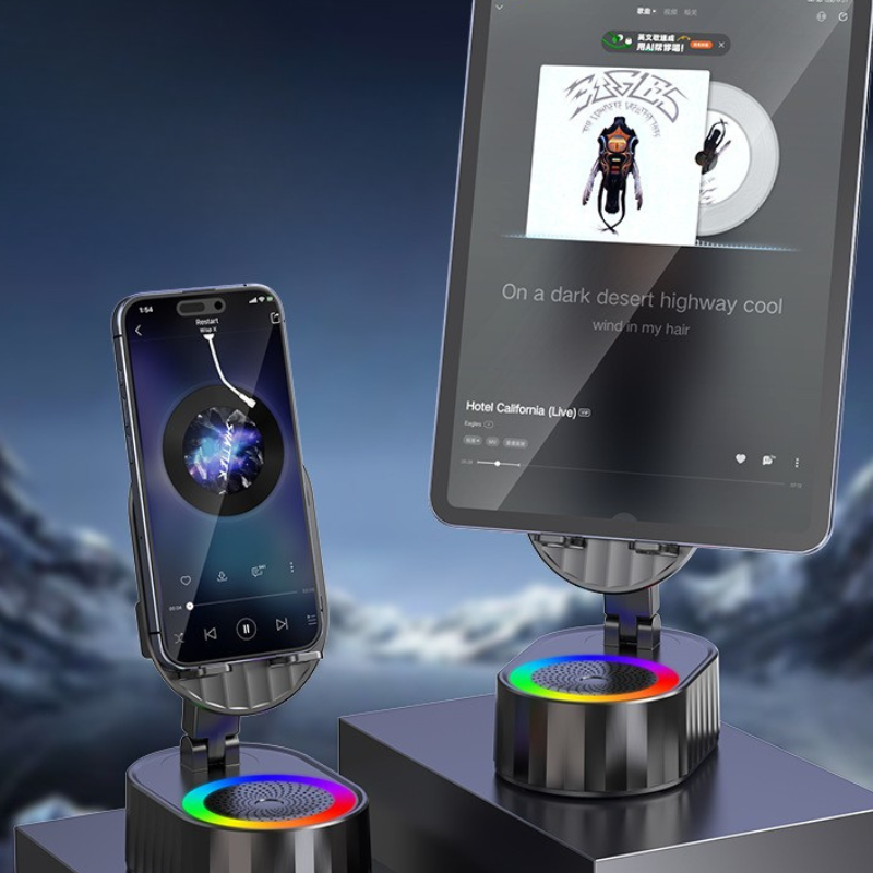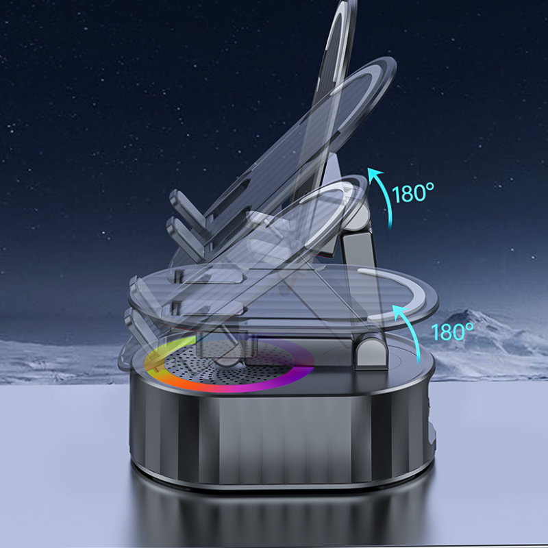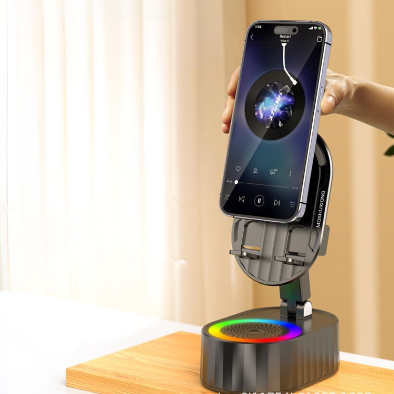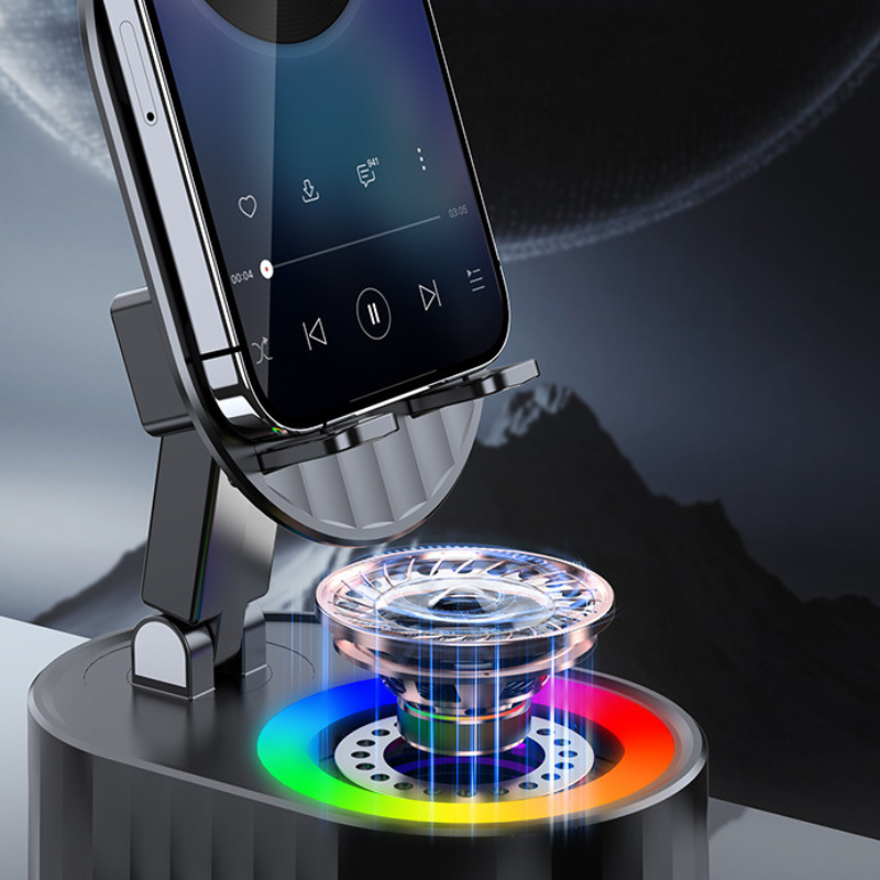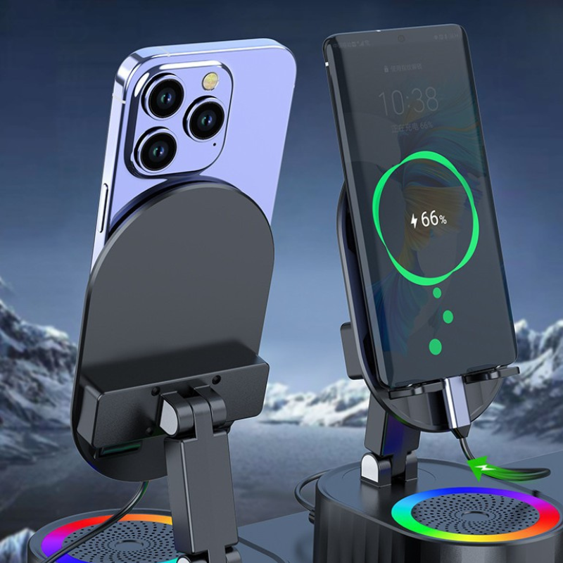 Un seul appareil qui sert d’enceinte Bluetooth, enceinte à induction, chargeur, support pour téléphone/tablette et lumière d’ambiance.